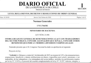 En una edición especial de tarde, este jueves 05 de febrero, y tras revisión de constitucionalidad en el Tribunal Constitucional y la Toma de Razón en la Contraloría General de la República, el Diario Oficial publicó la Ley N° 21.806, que otorga reajuste general de remuneraciones a las y los trabajadores del sector público concede aguinaldos que señala, concede otros beneficios que indica y modifica diversos cuerpos legales.