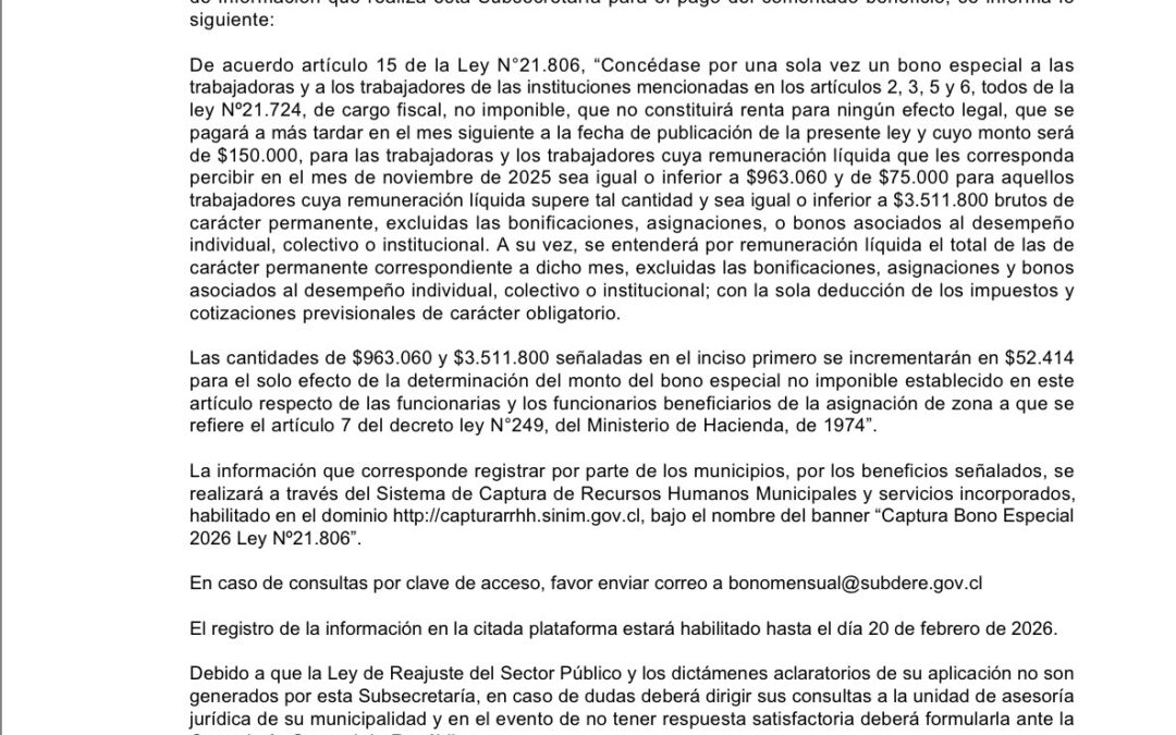 Se informa Oficio Nº608/2026 que da inicio al proceso de captación de solicitudes del Bono Especial 2026 para los y las colaboradoras de servicios traspasados a los municipios. OFICIO_ORD_608-2026