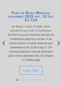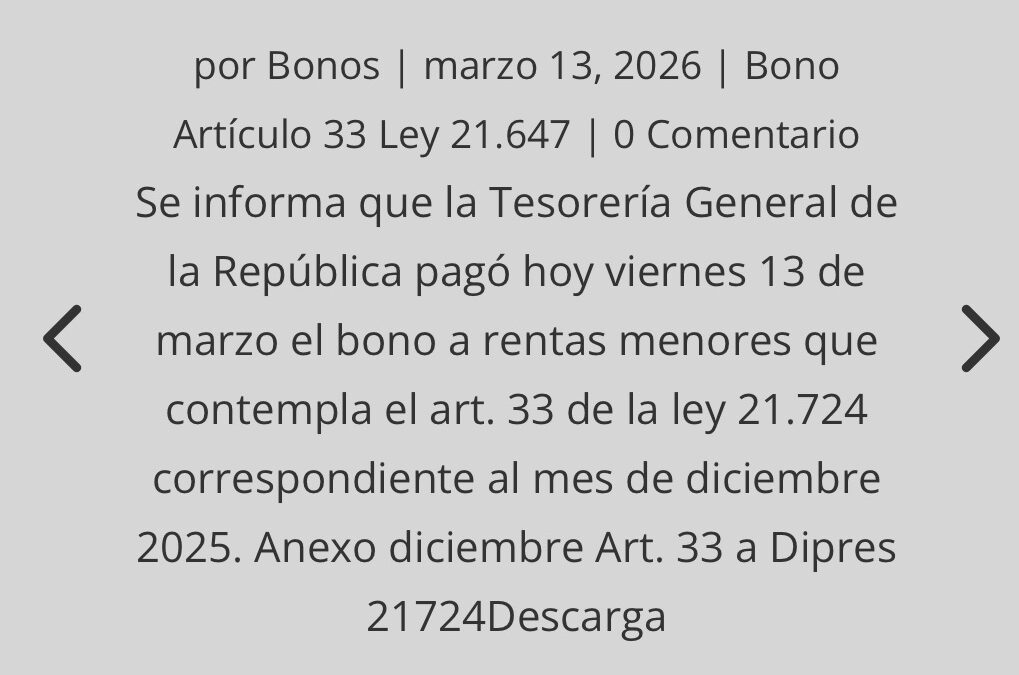 Se informa que la Tesorería General de la República pagó hoy viernes 13 de marzo el bono a rentas menores que contempla el art. 33 de la ley 21.724 correspondiente al mes de diciembre 2025.
